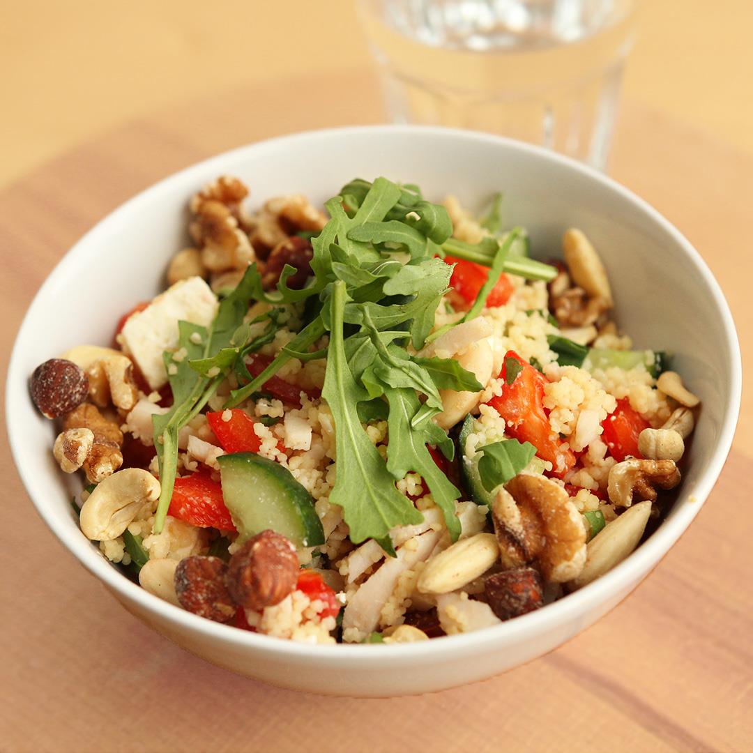 - Voeg de komkommer, tomaatjes, paprika, kipreepjes, feta, notenmix en rucola toe aan de couscous;