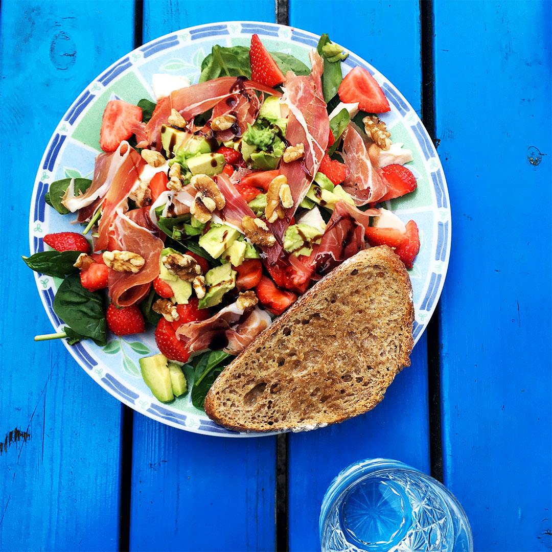 Stap 3: Verdeel de babyspinazie over 2 borden. Verdeel de aardbeien, avocado, mozzarella over de spinazie. Trek de serranoham in stukjes en verdeel over de borden.