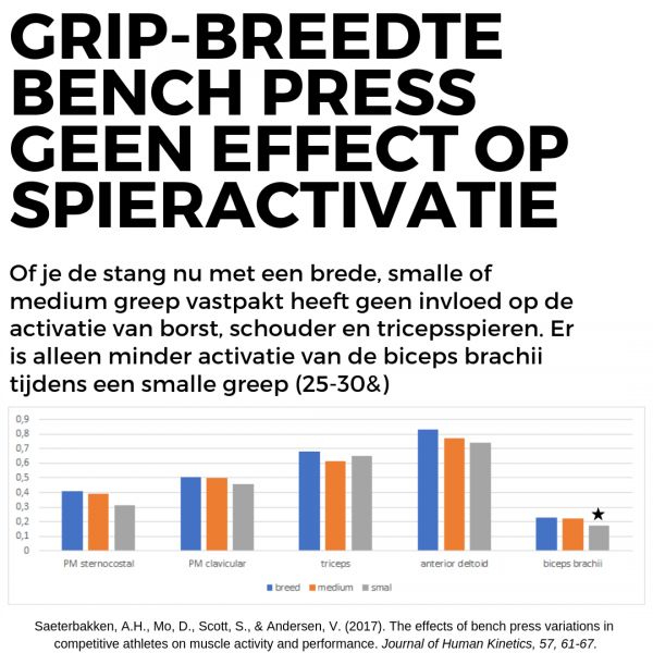 In de infographic hieronder zie je de samenvatting uit het onderzoek naar de activatie van o.a. borst, triceps, schouder en bicepsspieren tijdens de verschillende gripbreedten die je tijdens het bankdrukken kunt pakken (smal, neutraal, breed). De smalle greep was 42 cm, neutraal 61.5 cm en breed 81 centimeter. Zoals je kunt zien is er geen enkel verschil in activatie van de borstspier, zowel in het zogenaamde claviculaire gedeelte als sternocostale gedeelte. Het claviculaire deel is het gedeelte bij je sleutelbeen (bovenkant borst) en het sternocostale deel is meer richting de onderkant van je borst. Waar de broscience ons adviseert om breder te pakken voor meer borst activatie, zegt de ‘echte’ wetenschap dat dit niets uitmaakt. Hetzelfde geldt voor de triceps en schouders. De enige spier die minder wordt geactiveerd tijdens een smalle greep t.o.v. de andere grepen is de biceps brachii.