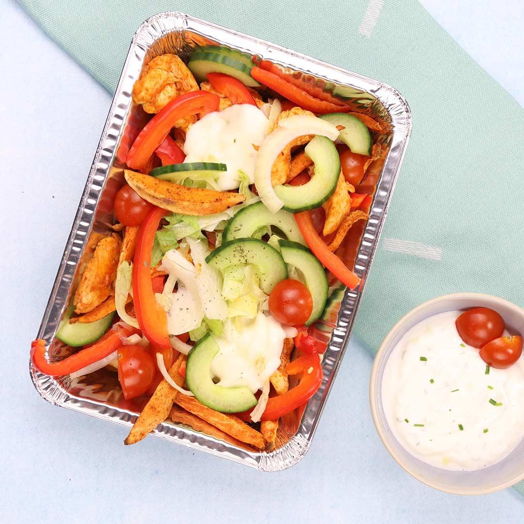 Stap 4. Verdeel de frietjes over de bodem van het aluminium bakje (of ovenschaaltje). Bedek deze met de kip, ui, paprika en als laatste met de plakjes mozzarella. Laat 10 min. gratineren in de oven.