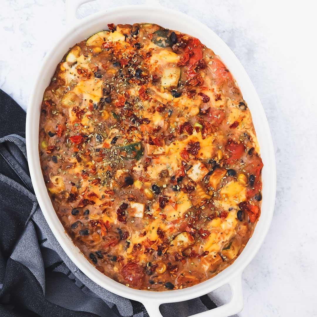 Stap 1: Meet en weeg alle ingrediënten af. Mix alle kruiden in een kommetje. Laat de bonen en de maïs uitlekken. Dep de tofu met een theedoek droog. Snijd de tofu daarna in blokjes van een halve centimeter dik. Snijd daarna de courgette door de helft en halveer deze helften nog eens. Verwijder de zaadlijsten van de courgette. Snijd daarna de courgette in blokjes van circa 1/2 – 1 centimeter.Stap 2: Verwarm een grote, diepe koekenpan op het vuur en bak de tofu in de 4 eetlepels wokolie goudbruin. Voeg daarna de amandelmelk, de tomatenpuree, de gezeefde tomaten, de courgette en alle kruiden toe. Roer even goed en laat het daarna 10 minuten sudderen op middellaag vuur. Voeg daarna de zwarte bonen en de maïs toe. Verwarm dit 3 – 4 minuten op middellaag vuur.
